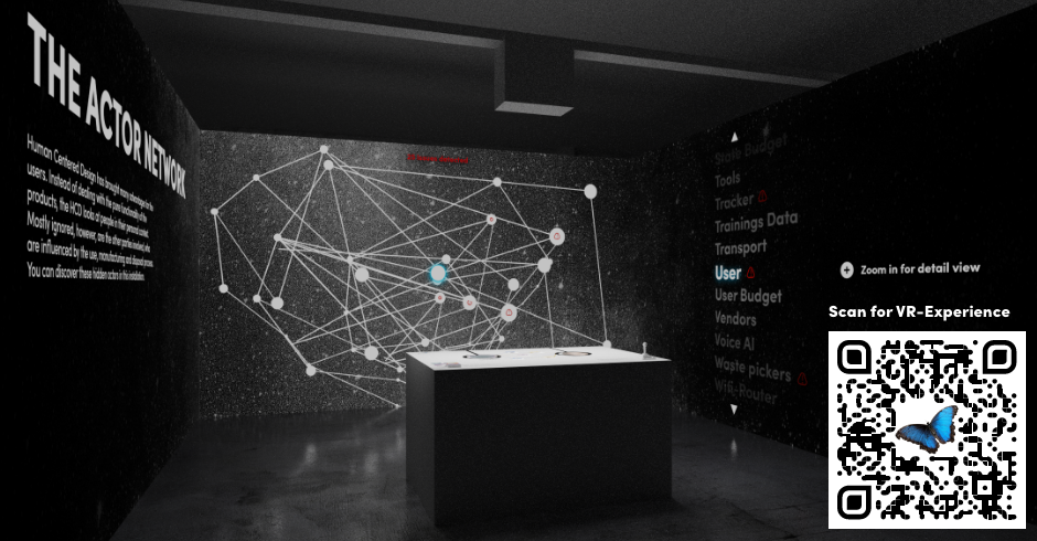 The Butterfly in the Room takes visitors on a journey through the hidden networks of actors that surround us all. It was created with the intention to serve as an object for discourse on more-than-human design, to give designers the opportunity to explore the subject and related consequences of their own design. The project deals with the question of how the invisible networks of actors are influenced by human design and how these consequences and the networks themselves can be made visible. Based on the previous research project, Entangled Interfaces, a network of actors surrounding an unnamed Internet Of Things (IoT) device was explored and analyzed.